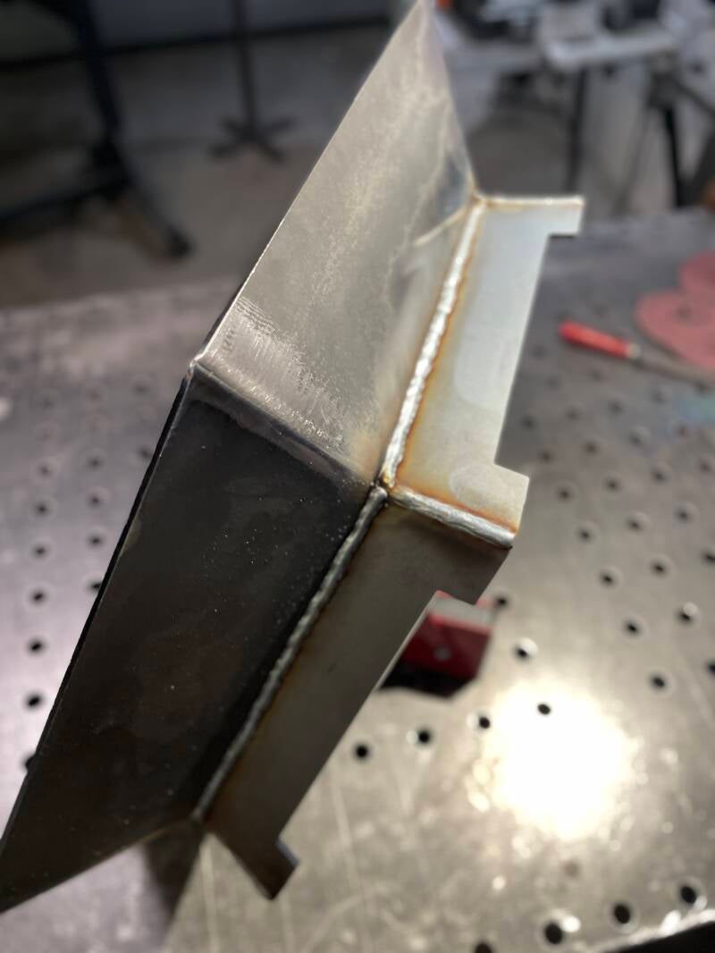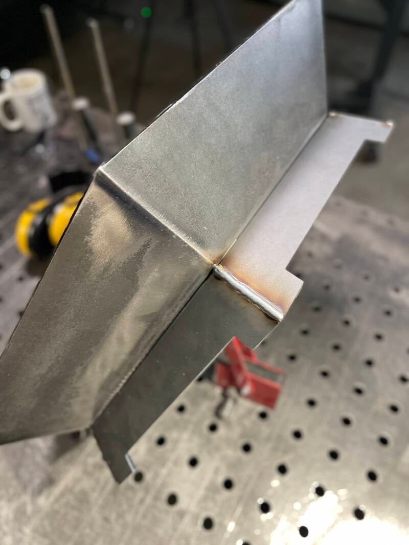 Wenn die Grundplatte fixiert ist, können Sie die Seitenwangen verschweißen. Hierfür empfehle ich fallend zu schweißen.