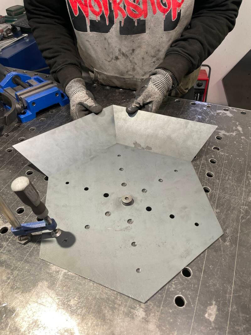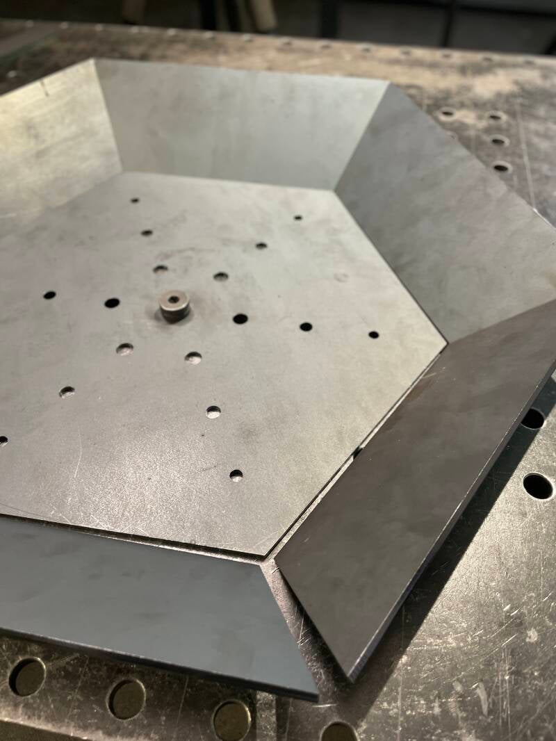 Die verbliebenen Streben dienen zur Verstärkung der Grundplatte. Diese können diagonal von unten in den Sockel verschweißt werden, um ein Wölben der Grundplatte beim Feuer zu verhindern. Achten Sie darauf, dass die Löcher frei bleiben.